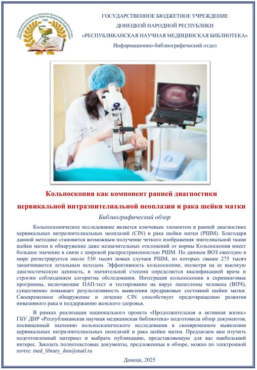 В рамках реализации национального проекта «Продолжительная и активная жизнь» ГБУ ДНР «Республиканская научная медицинская библиотека» подготовила обзор документов, посвященный значению кольпоскопического исследования в своевременном выявлении цервикальных интраэпителиальных неоплазий и рака шейки матки. 14 апреля 2025 Подробнее
