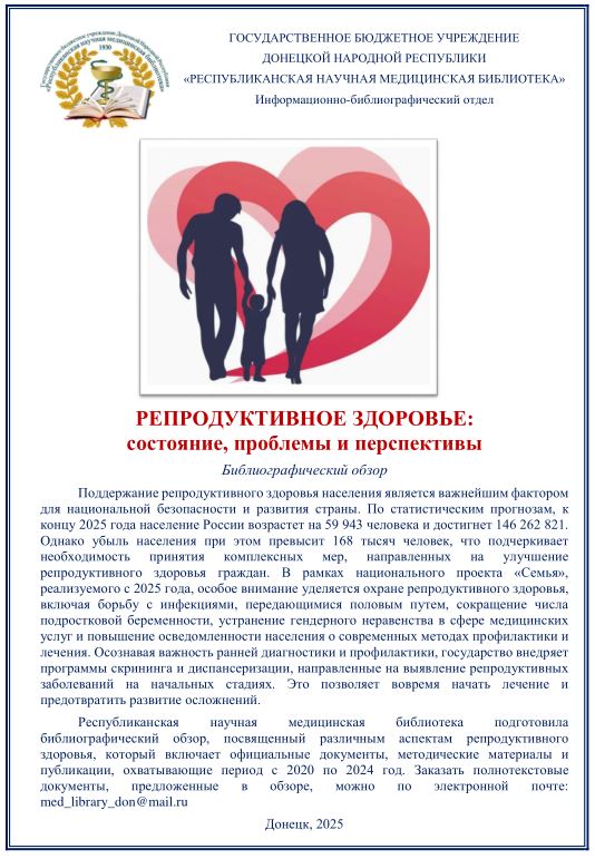 В рамках национального проекта России «Семья», Республиканская научная медицинская библиотека подготовила библиографический обзор, посвященный различным аспектам репродуктивного здоровья, который включает официальные документы, методические материалы и публикации, охватывающие период с 2020 по 2024 год. 23 марта 2025 Подробнее