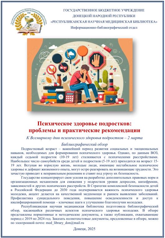 2 марта — Всемирный день психического здоровья подростков! Республиканская научная медицинская библиотека подготовила библиографический обзор, касающийся различных аспектов психического здоровья молодежи. В обзоре представлены нормативные и методические документы, а также публикации, охватывающие период с 2019 по 2024 год. 27 февраля 2025 Подробнее