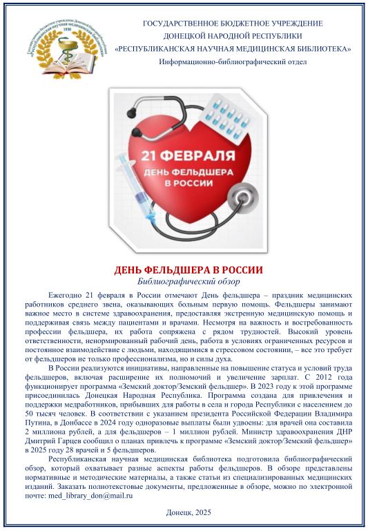 21 февраля — День фельдшера в России! Республиканская научная медицинская библиотека подготовила библиографический обзор, который охватывает разные аспекты работы фельдшеров. В обзоре представлены нормативные и методические материалы, а также статьи из специализированных медицинских изданий. 20 февраля 2025 Подробнее