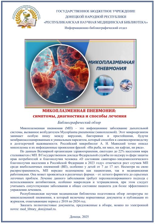 Предлагаем Вашему вниманию библиографический обзор литературы по микоплазменной пневмонии, в который включены нормативные документы и публикации из журналов, охватывающие период с 2018 по 2024 год. 02 марта 2025 Подробнее