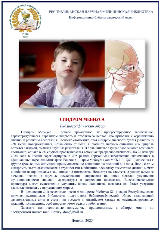 В преддверии Дня осведомленности о синдроме Мебиуса (24 января) Республиканская научная медицинская библиотека подготовила библиографический обзор, включающий законодательные акты и статьи на русском и английском языках из специализированных изданий, посвященных особенностям этого редкого заболевания. Предлагаем ознакомиться! 22 января 2025 Подробнее