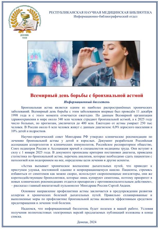 23 декабря — Всемирный день борьбы с бронхиальной астмой! Предлагаем Вашему вниманию информационный бюллетень! 20 декабря 2024 Подробнее