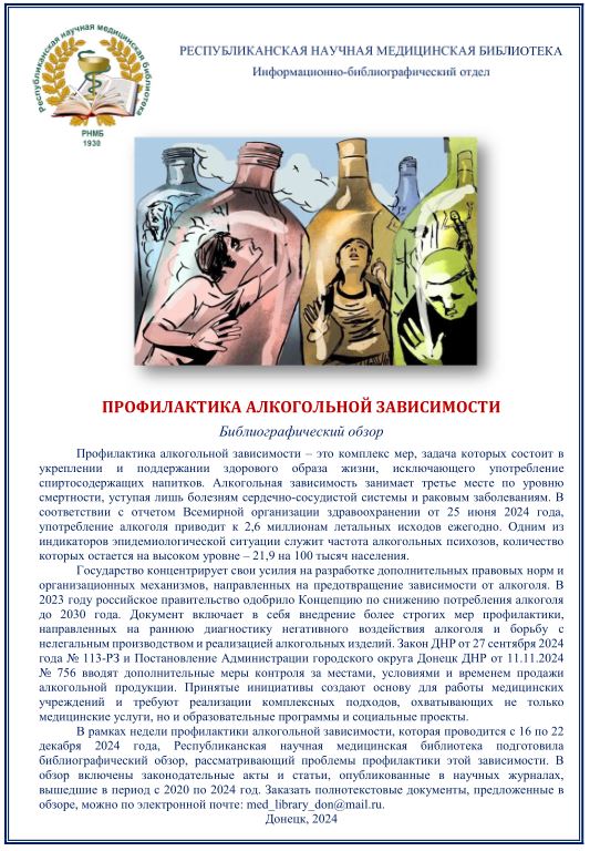 В рамках Недели профилактики алкогольной зависимости, Республиканская научная медицинская библиотека подготовила библиографический обзор, рассматривающий проблемы профилактики этой зависимости. 15 декабря 2024 Подробнее