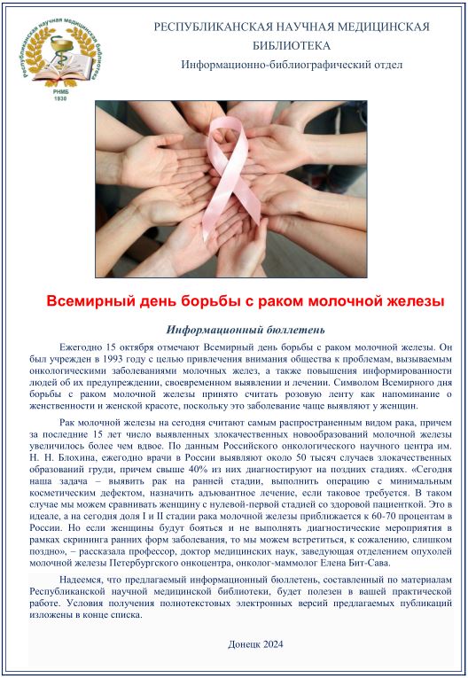 15 октября — Всемирный день борьбы с раком молочной железы. Он был учрежден Всемирной организацией здравоохранения в 1993 году с целью привлечения внимания общества к проблемам, вызываемым онкологическими заболеваниями молочных желез, а также повышения информированности людей об их предупреждении, своевременном выявлении и лечении. Согласно письма Министерства здравоохранения ДНР с 14 по 20 октября в библиотеке проводится тематическая неделя, в рамках которой представлена книжная выставка 11 октября 2024 Подробнее