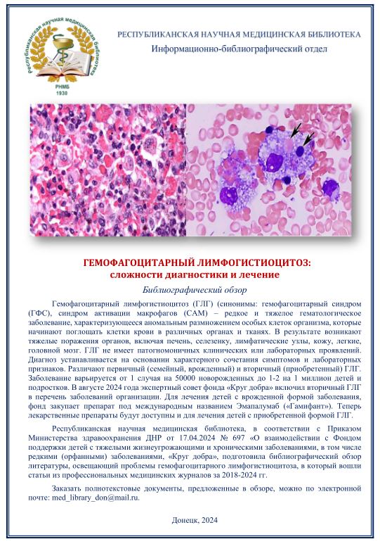 В соответствии с Приказом Министерства здравоохранения Донецкой Народной Республики от 17.04.2024 г. № 697 «О взаимодействии с Фондом поддержки детей с тяжелыми жизнеугрожающими и хроническими заболеваниями, в том числе редкими (орфанными) заболеваниями, «Круг добра», представляем библиографический обзор 02 октября 2024 Подробнее