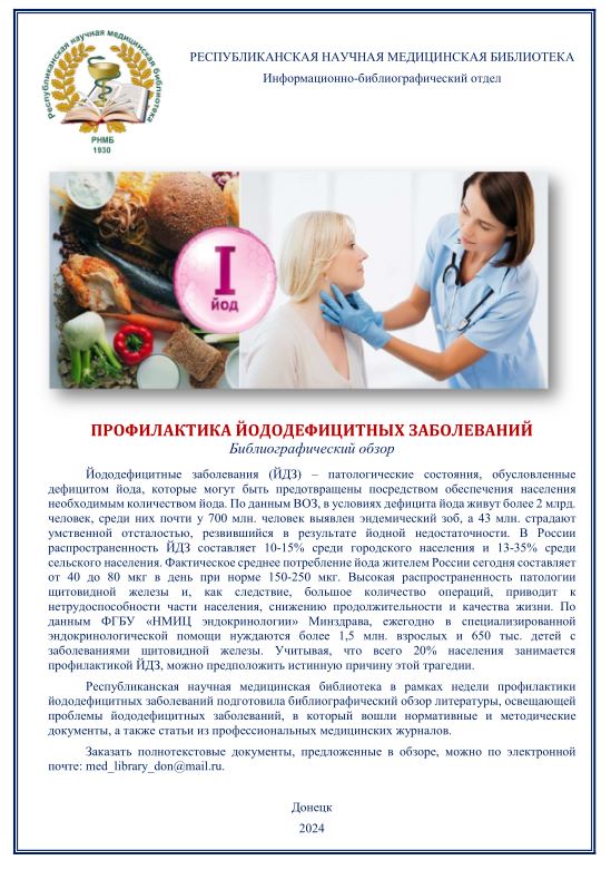Неделя профилактики йододефицитных заболеваний! Предлагаем Вашему вниманию библиографический обзор литературы, в который вошли нормативные и методические документы, а также статьи из профессиональных медицинских журналов. 20 октября 2024 Подробнее