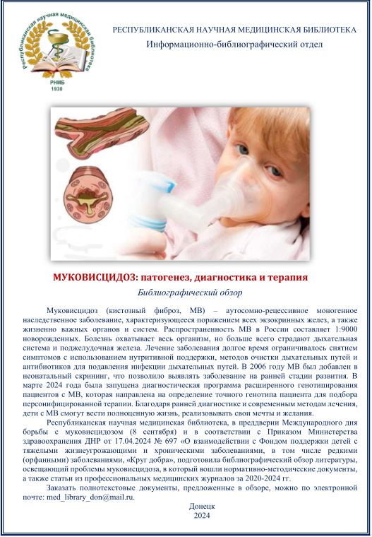 8 сентября — Международный день борьбы с муковисцидозом. В соответствии с Приказом Министерства здравоохранения ДНР от 17.04.2024 № 697 «О взаимодействии с Фондом поддержки детей с тяжелыми жизнеугрожающими и хроническими заболеваниями, в том числе редкими (орфанными) заболеваниями, «Круг добра», представляем библиографический обзор литературы,освещающий проблемы муковисцидоза, в который вошли нормативно-методические документы, а также статьи из профессиональных медицинских журналов за 2020-2024 гг. 03 сентября 2024 Подробнее